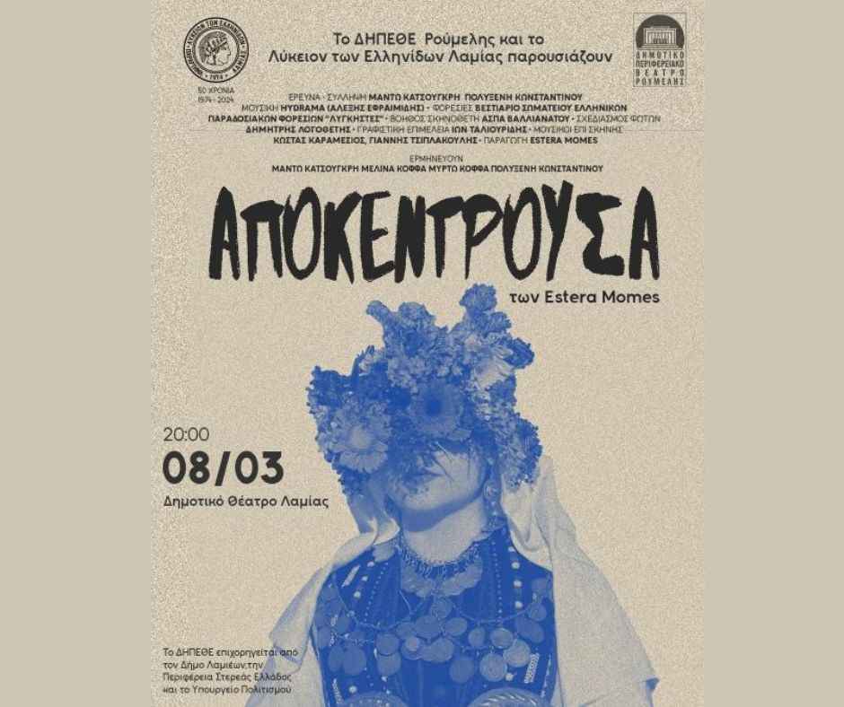 Το ΔΗΠΕΘΕ Ρούμελης και το Λύκειο των Ελληνίδων Λαμίας παρουσιάζουν την παράσταση «Αποκέντρουσα» της θεατρικής ομάδας Estera Momes, το Σάββατο 8 Μαρτίου, στις 20:00 στο Δημοτικό Θέατρο Λαμίας, σε μια μοναδική βραδιά αφιερωμένη στη γυναικεία εμπειρία και τη διαχρονική μετάβαση της γυναίκας στους διαφορετικούς ρόλους της ζωής της.