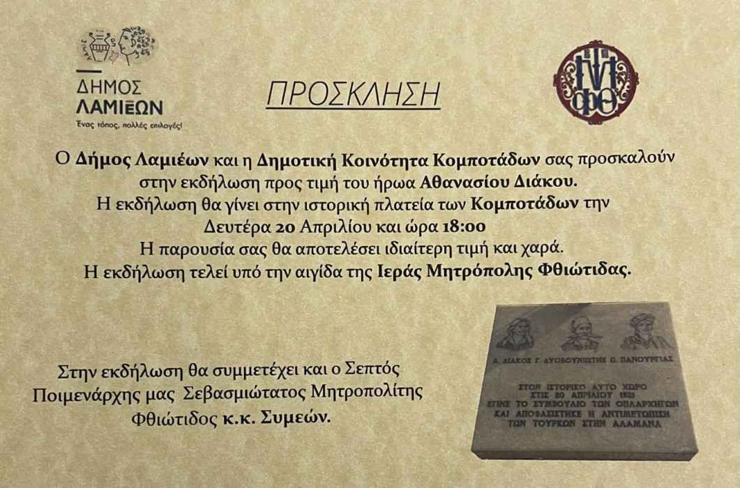 Ο Δήμος Λαμιέων σε συνεργασία με την Δημοτική Κοινότητα Κομποτάδων, στο πλαίσιο των εκδηλώσεων προς τιμήν του ήρωα Αθανασίου Διάκου και της επετείου της μάχης της Αλαμάνας, διοργανώνει «Εκδήλωση προς τιμήν του ήρωα Αθανασίου Διάκου» που θα πραγματοποιηθεί την Δευτέρα 20 Απριλίου 2026 και ώρα 18.00 στην ιστορική πλατεία  Κομποτάδων, υπό την αιγίδα της Ιεράς Μητρόπολης Φθιώτιδας.