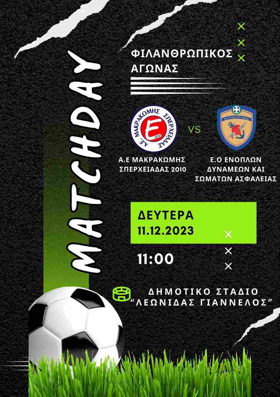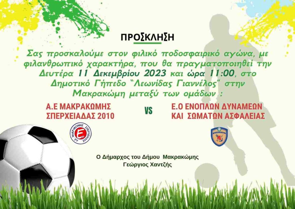 Ο Δήμος Μακρακώμης σας προσκαλεί την Δευτέρα 11 Δεκεμβρίου 2023 και ώρα 11:00, στο Δημοτικό Γήπεδο “Λεωνίδας Γιαννέλος” στην Μακρακώμη, όπου θα πραγματοποιηθεί φιλικός ποδοσφαιρικός αγώνας, με φιλανθρωπικό χαρακτήρα, μεταξύ των ομάδων Α.Ε ΜΑΚΡΑΚΩΜΗΣ ΣΠΕΡΧΕΙΑΔΑΣ 2010 – Ε.Ο ΕΝΟΠΛΩΝ ΔΥΝΑΜΕΩΝ ΚΑΙ ΣΩΜΑΤΩΝ ΑΣΦΑΛΕΙΑΣ.