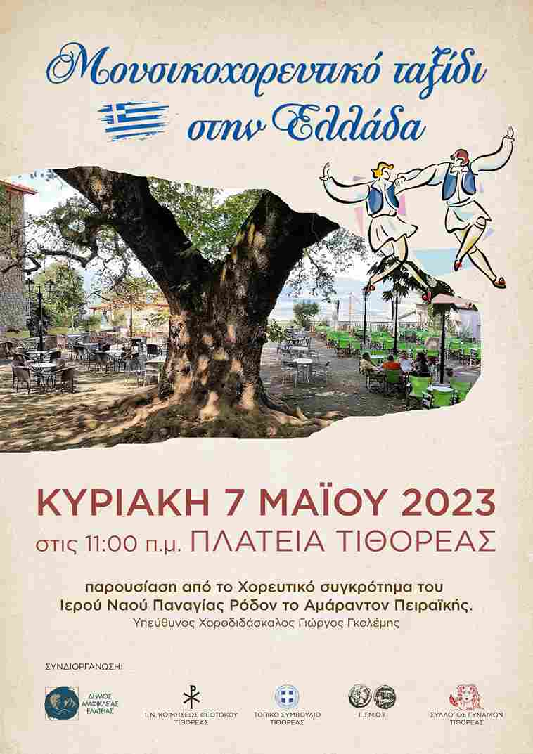 Σας προσκαλούμε σε ένα όμορφο μουσικοχορευτικό ταξίδι με παραδοσιακά τραγούδια και χορούς από την Ελλάδα, την Κυριακή 7 Μαΐου 2023 και ώρα 11:00π.μ. στην πλατεία της Τιθορέας.