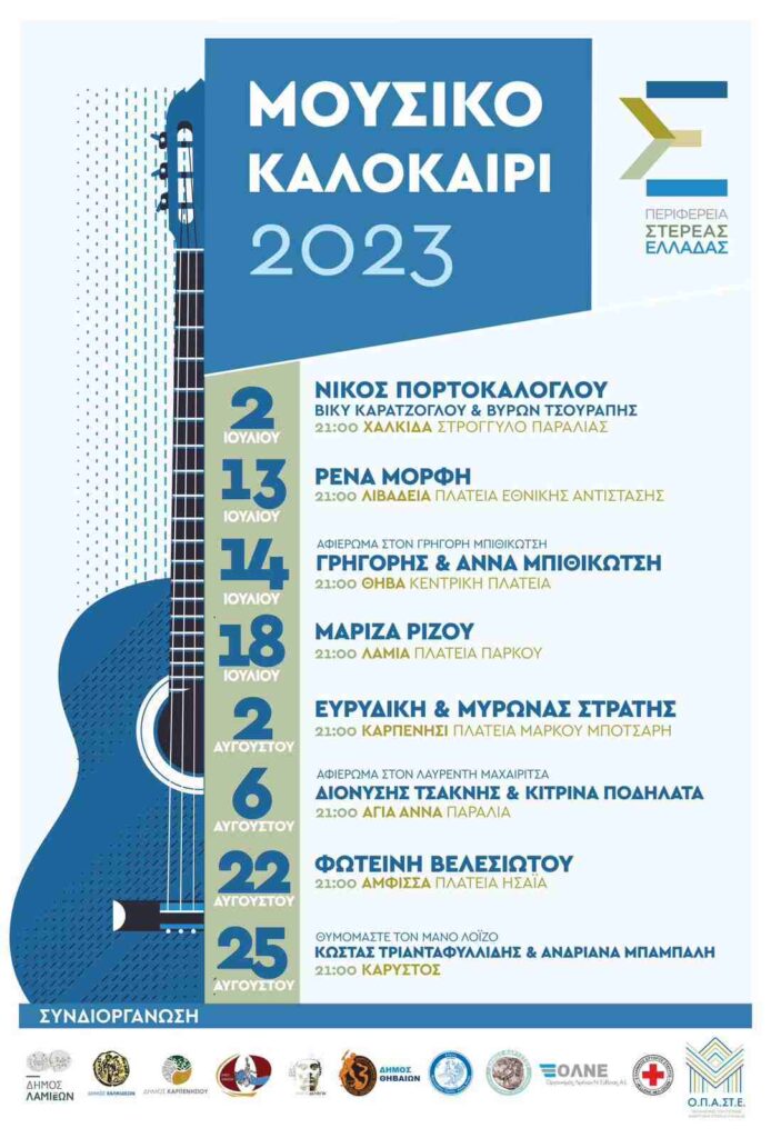 Το «Μουσικό Καλοκαίρι 2023», διοργανώνεται από την Περιφέρεια Στερεάς Ελλάδας με την υποστήριξη των Δήμων Λαμιέων, Χαλκιδέων, Καρπενησίου, Λεβαδέων, Δελφών, Θηβαίων, Καρύστου και Μαντουδίου – Λίμνης – Αγ. Άννας και σε συνεργασία με τον Οργανισμό Λιμένων Νομού Εύβοιας και με τον Ελληνικό Ερυθρό Σταυρό.