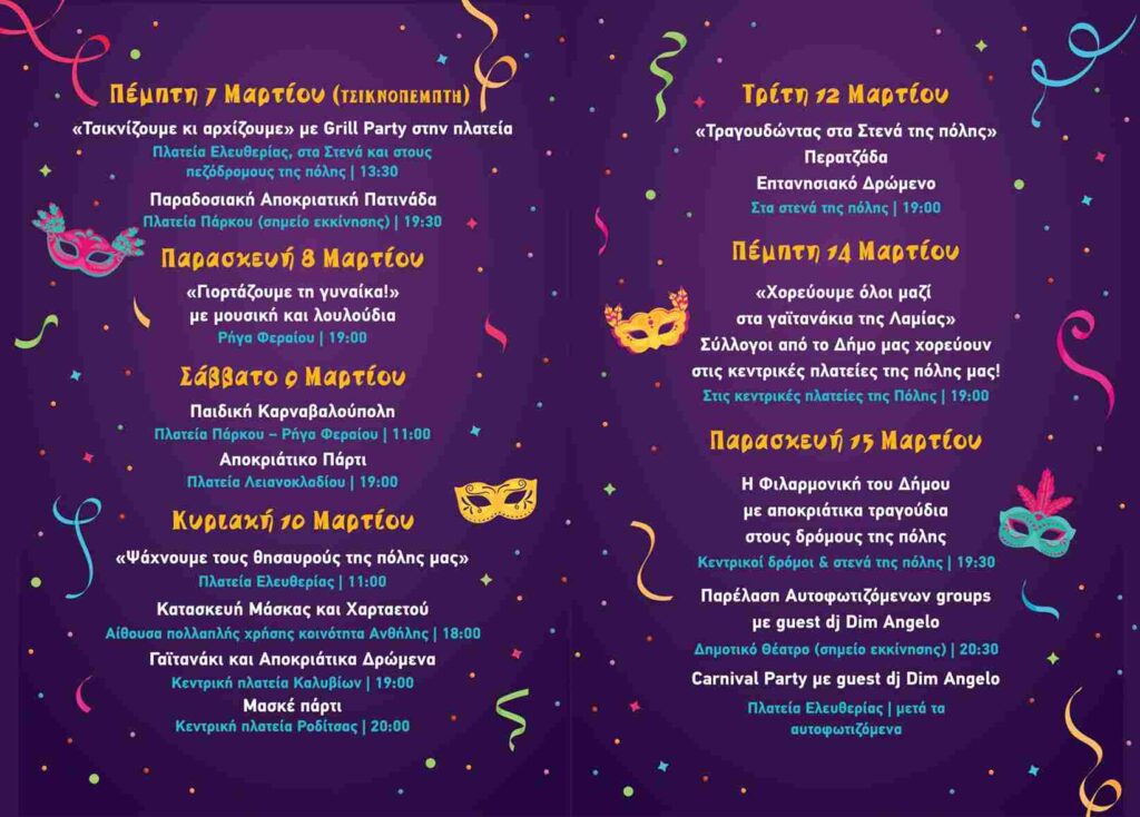 Ελάτε όλοι να ξεφαντώσουμε, με κέφι, τραγούδια και χορό σε ρυθμούς Λαμιώτικου Καρναβαλιού.