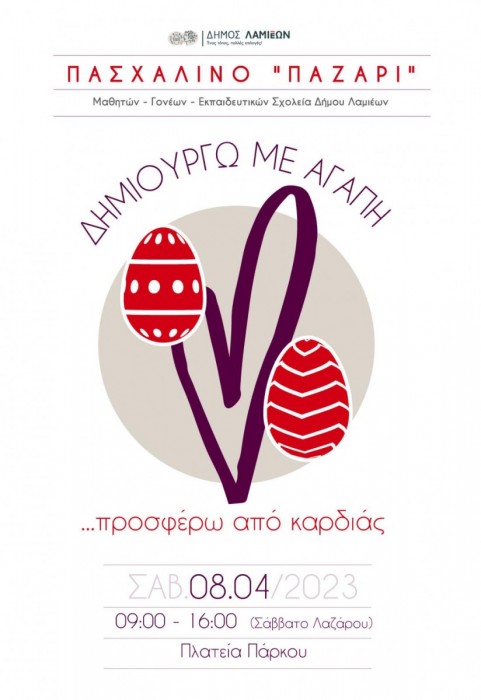Με σύνθημα «Δημιουργώ με αγάπη … προσφέρω από καρδιάς» για τις άγιες ημέρες του Πάσχα, ο Δήμος Λαμιέων διοργανώνει το 1ο Πασχαλινό «Παζάρι» μαθητών – γονέων – εκπαιδευτικών των σχολείων του Δήμου Λαμιέων, το Σάββατο 8 Απριλίου στην πλατεία Πάρκου και ώρες από 9:00 έως 16:00.