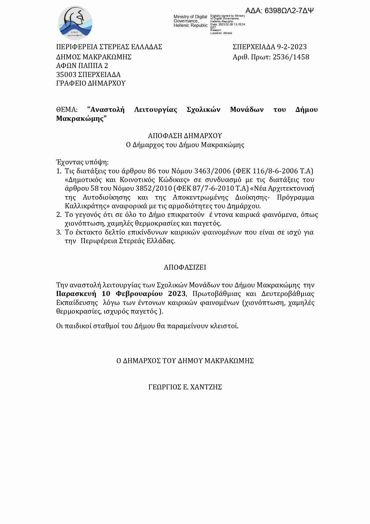 Ενημερώνουμε ότι Παρασκευή 10/02/2023 με Απόφαση Δημάρχου του Δήμου Μακρακώμης όλες οι Σχολικές Μονάδες Πρωτοβάθμιας και Δευτεροβάθμιας Εκπαίδευσης του Δήμου θα παραμείνουν κλειστές λόγω των έντονων καιρικών φαινομένων (χιονόπτωση, ισχυρός παγετός).