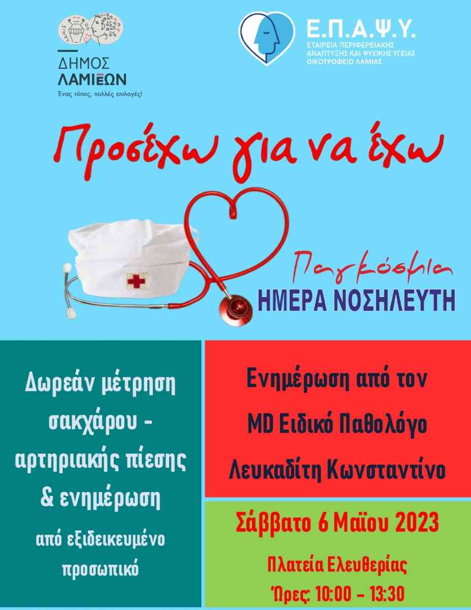 Η εκδήλωση λαμβάνει χώρα με την αφορμή την Παγκόσμια Ημέρα Νοσηλευτή και έχει σκοπό την ενημέρωση για την αξία της πρόληψης στα θέματα διαχείρισης της αρτηριακής πίεσης και του σακχαρώδους διαβήτη. Θα πραγματοποιηθούν δωρεάν  μετρήσεις αρτηριακής πιέσεως και σακχάρου όπως και ενημέρωση κοινού από τον ειδικό παθολόγο κο Λευκαδίτη Κων/νο. Η ομάδα που θα αναλάβει τη διεκπεραίωση της εκδήλωσης θα απαρτίζεται από νοσηλευτές / εργαζόμενους στο Οικοτροφείο της ΕΠΑΨΥ Λαμίας.