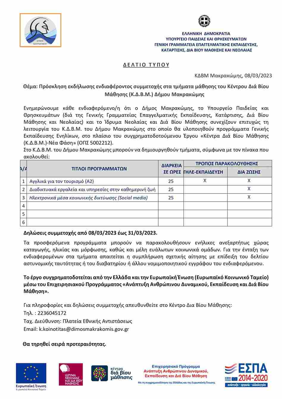 Πρόσκληση εκδήλωσης ενδιαφέροντος συμμετοχής στα τμήματα μάθησης του Κέντρου Διά Βίου Μάθησης (Κ.Δ.Β.Μ.) Δήμου Μακρακώμης