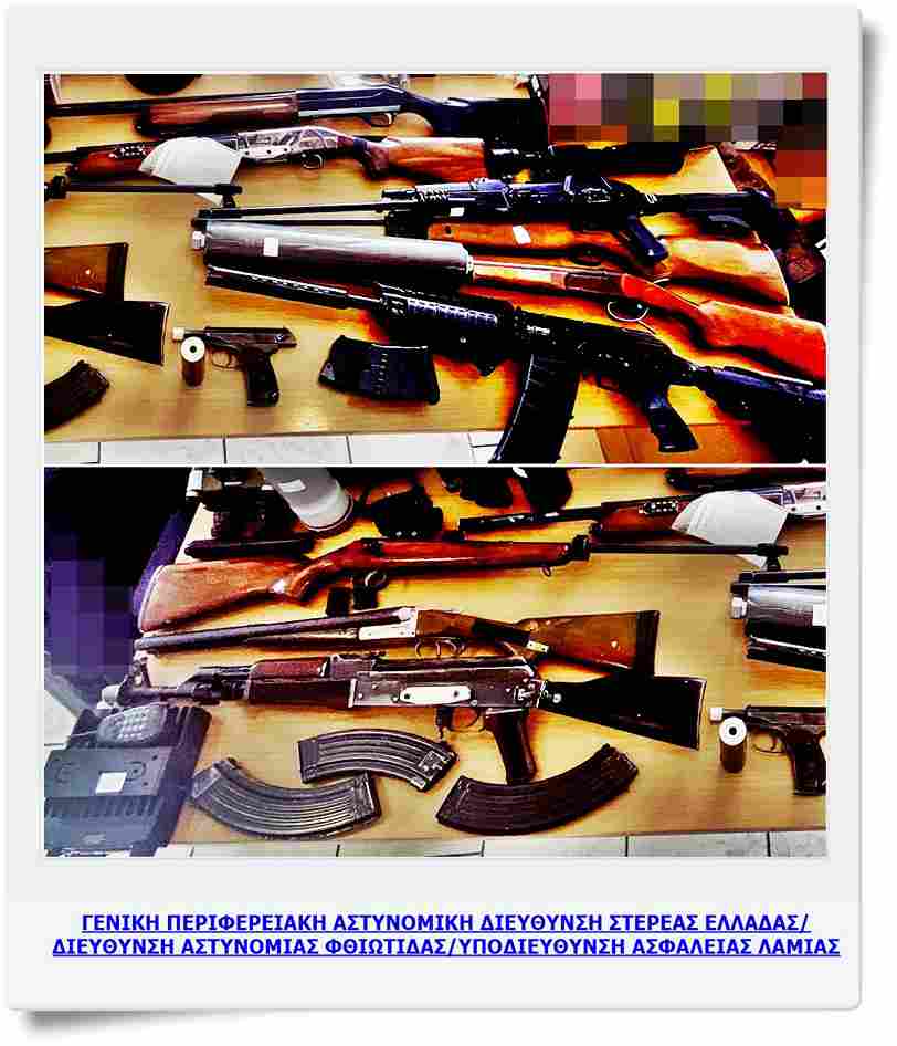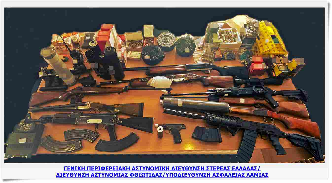 Συνελήφθη ημεδαπός, χθες (21-03-2023) το πρωί σε περιοχή της Φθιώτιδας, από αστυνομικούς της Υποδιεύθυνσης Ασφαλείας Λαμίας, για παραβάσεις νομοθεσιών περί όπλων και του τελωνειακού κώδικα. Ειδικότερα, μετά από κατάλληλη αξιοποίηση πληροφοριακών στοιχείων σχετικά με κατοχή μεγάλου αριθμού όπλων και πυρομαχικών, διενεργήθηκε νομότυπη έρευνα στην οικία του ανωτέρω, εντός της οποίας, καθώς και σε αποθηκευτικό χώρο αυτής βρέθηκαν και κατασχέθηκαν:
