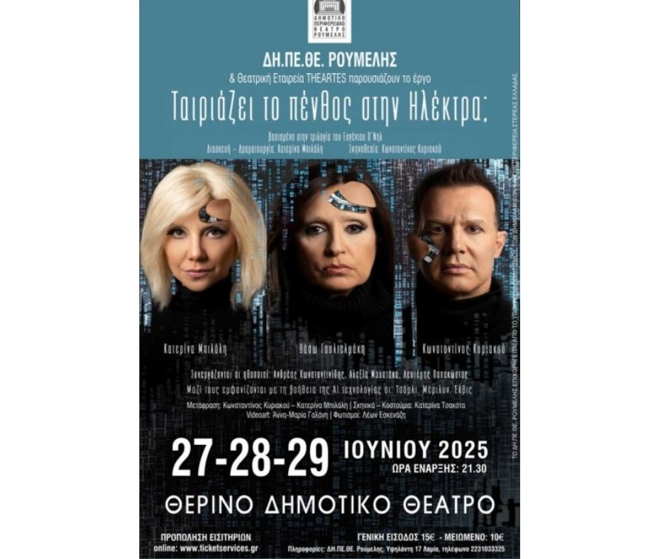Το ΔΗΠΕΘΕ Ρούμελης στο πλαίσιο της Κεντρικής Σκηνής και η Θεατρική Εταιρεία THEATRES, παρουσιάζουν την παράσταση «Ταιριάζει το πένθος στην Ηλέκτρα;», την Παρασκευή 27, το Σάββατο 28 και την Κυριακή 29 Ιουνίου, στις 21:30 στο Θερινό Δημοτικό Θέατρο Λαμίας. Το έργο των Κωνσταντίνου Κυριακού και Κατερίνας Μπιλάλη, οι οποίοι συμπρωταγωνιστούν στη σκηνή του θεάτρου με την Βάσω Γουλιελμάκη, είναι βασισμένο στην τριλογία του Ευγένιου Ο’ Νηλ με εντυπωσιακά τεχνολογικά εφέ, γεμάτη μυστήριο, ανατροπές και επίκαιρα ερωτήματα. Μπορεί, σε ένα όχι και τόσο μακρινό μέλλον, η τεχνολογία να αποδειχθεί ο μεγαλύτερος εξουσιαστής της ανθρώπινης φύσης και ο υποκινητής φρικτών πράξεων;