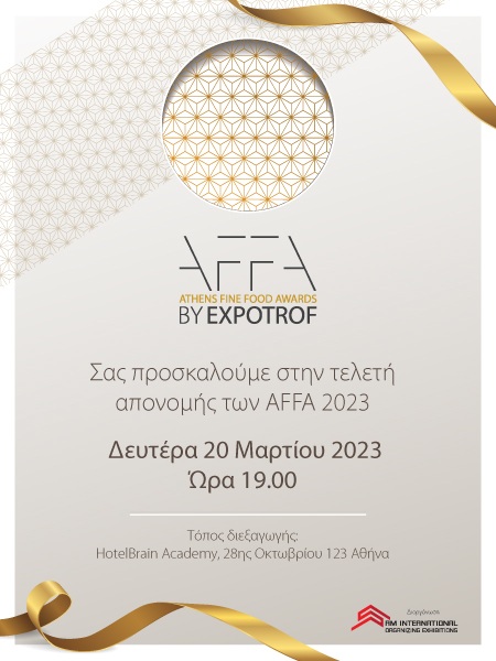 Με μεγάλη χαρά ανακοινώνουμε πως η τελετή απονομής των βραβείων ποιότητας και γεύσης Athens Fine Food Awards (AFFA) 2023, θα πραγματοποιηθεί την Δευτέρα 20 Μαρτίου 2023, ώρα 19.00, στην πρότυπη ακαδημία “HotelBrain Academy” του ξενοδοχειακού Ομίλου HotelBrain Group.