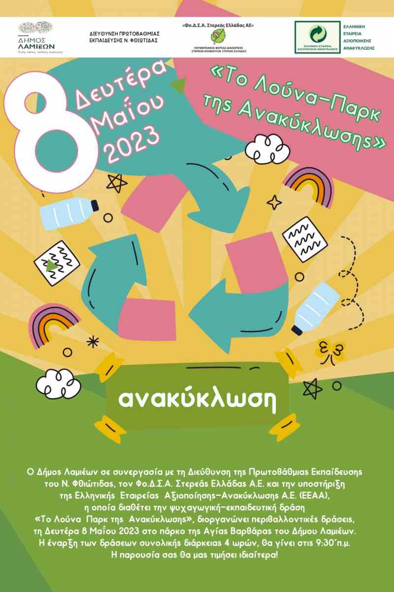 Ο Δήμος Λαμιέων σε συνεργασία με τη Διεύθυνση της Πρωτοβάθμιας Εκπαίδευσης του Νομού Φθιώτιδας, τον Φο.Δ.Σ.Α Στερεάς Ελλάδας Α.Ε. και την υποστήριξη της Ελληνικής Εταιρείας Αξιοποίησης – Ανακύκλωσης Α.Ε. (ΕΕΑΑ), η οποία διαθέτει την ψυχαγωγική – εκπαιδευτική δράση «Το Λούνα Παρκ της Ανακύκλωσης», διοργανώνει περιβαλλοντικές δράσεις, τη Δευτέρα 8 Μαΐου 2023 στο πάρκο της Αγίας Βαρβάρας του Δήμου Λαμιέων.