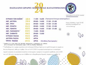 Το εορταστικό ωράριο για τα εμπορικά καταστήματα της πόλης κατά την Πασχαλινή Περίοδο ανακοινώθηκε από τον Εμπορικό Σύλλογο Λαμίας.