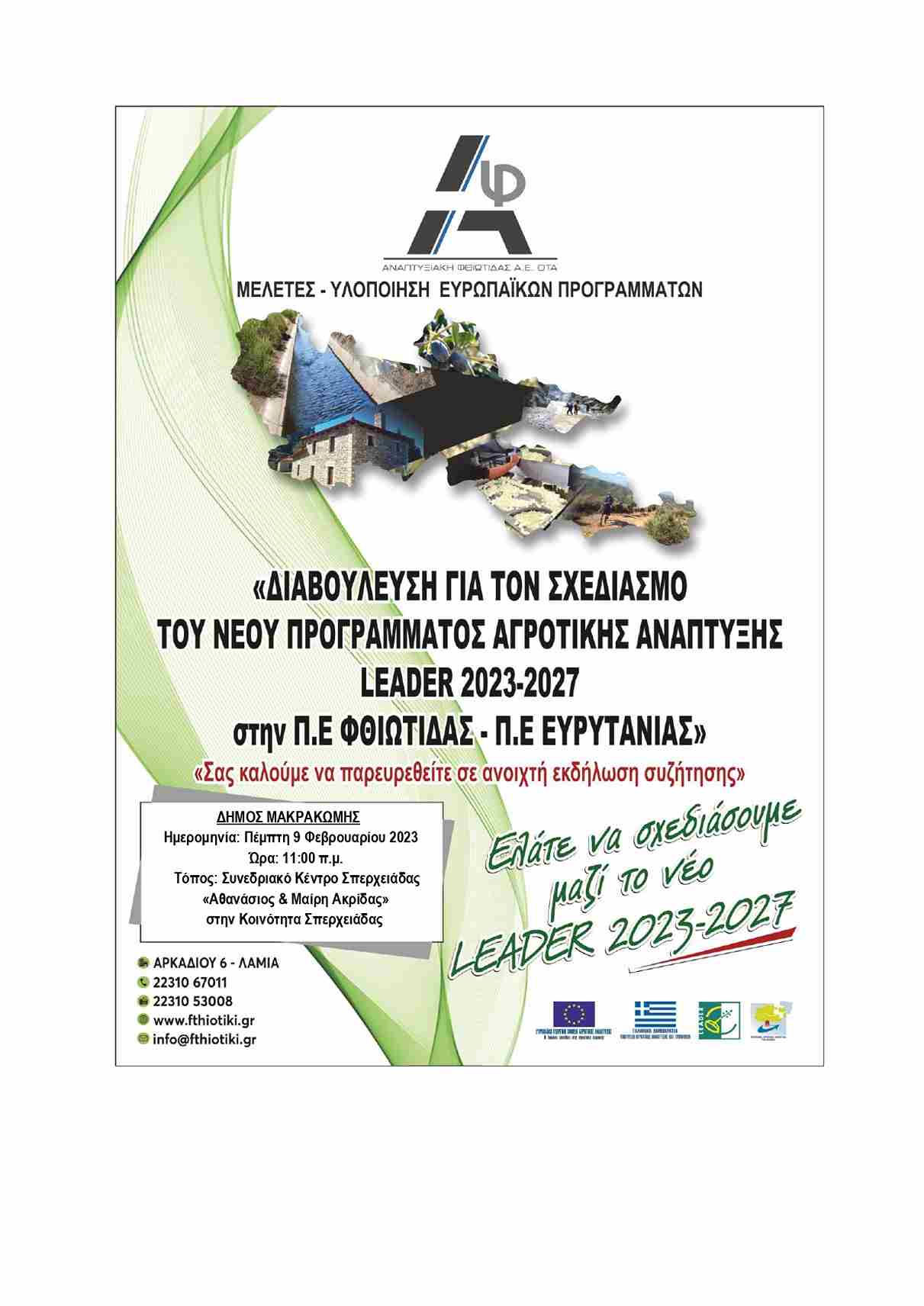 Υλοποίηση Ημερίδας για την ενημέρωση του τοπικού πληθυσμού για το νέο Τοπικό Πρόγραμμα LEADER ΣΣ ΚΑΠ 2023-2027 για την Π.Ε Φθιώτιδας και Π.Ε Ευρυτανίας