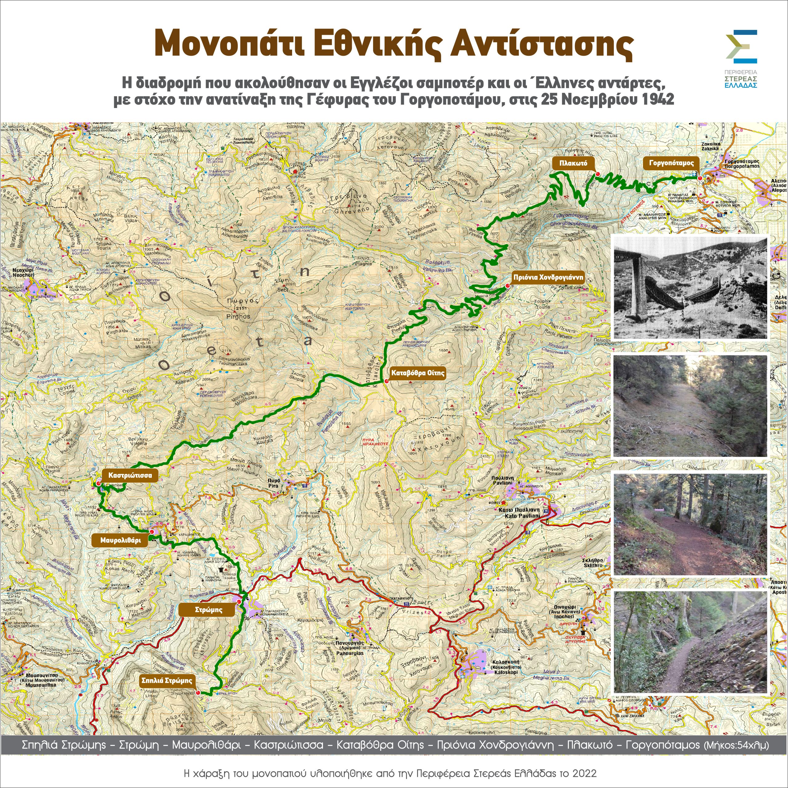 Επισημαίνεται, ότι η Περιφέρεια Στερεάς Ελλάδας έχει διανοίξει από το 2022 το λεγόμενο «Μονοπάτι Εθνικής Αντίστασης», δηλαδή τη διαδρομή που ακολούθησαν οι αντάρτες του ΕΛΑΣ – ΕΔΕΣ και οι Βρετανοί σαμποτέρ, το οποίο ξεκινά από τη σπηλιά στο χωριό Στρώμη και καταλήγει στη γέφυρα Γοργοποτάμου.