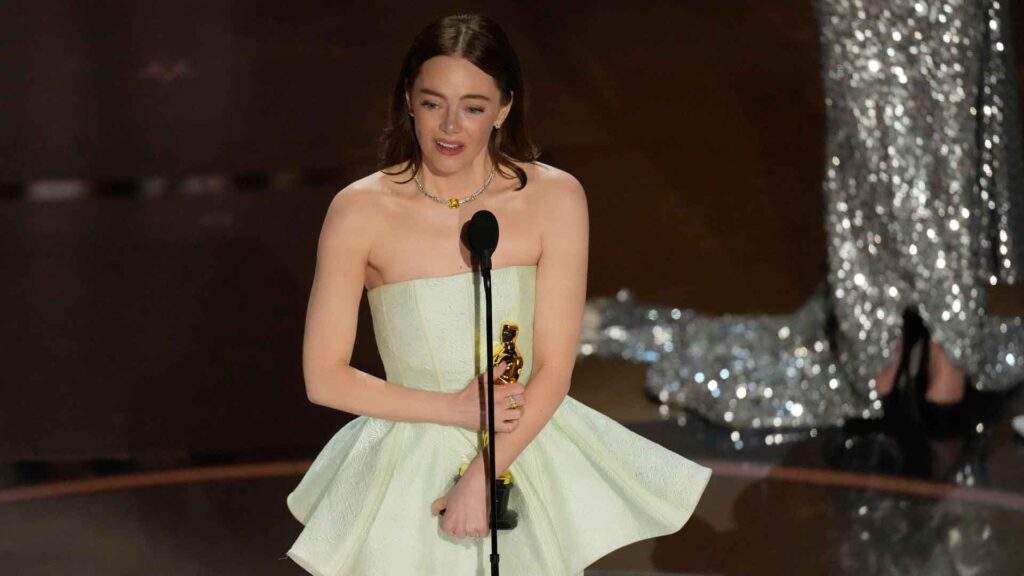 Η Εμα Στόουν παραλαμβάνει το Οσκαρ Α’ Γυναικείου Ρόλου για τον ρόλο της στην ταινία «Poor Things». Φωτ. AP/Chris Pizzello