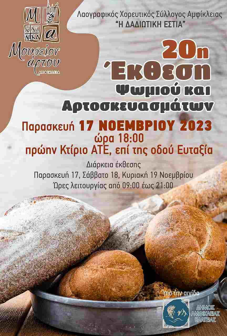 Πιστός στις παραδόσεις, τα ήθη και τα έθιμα του τόπου μας ο εμπνευστής και πρωτοπόρος Λαογραφικός – Χορευτικός Σύλλογος Αμφίκλειας “Η Δαδιώτικη Εστία” διοργανώνει και φέτος την 20η Έκθεση Ψωμιού & Αρτοσκευασμάτων, η οποία θα πραγματοποιηθεί από τις 17 έως και τις 19 Νοεμβρίου 2023 στο πρώην κτίριο ΑΤΕ, επί της οδού Ευταξία στην Αμφίκλεια.