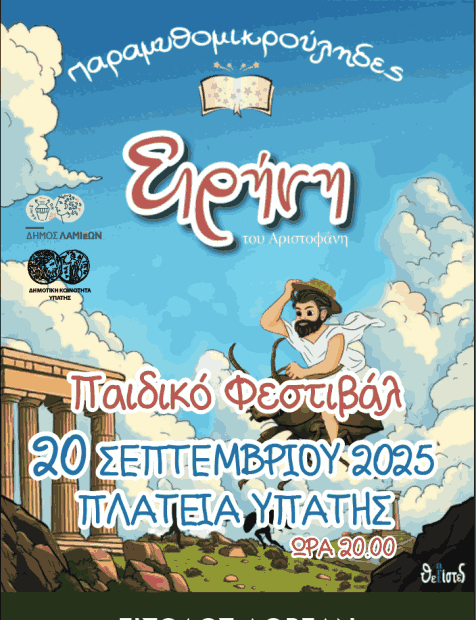 Ο Δήμος Λαμιέων και η Δημοτική Κοινότητα Υπάτης, στο πλαίσιο του Παιδικού Φεστιβάλ, διοργανώνουν μία μοναδική θεατρική παράσταση με την «Ειρήνη» του Αριστοφάνη από την ομάδα «Παραμυθομικρούληδες». Η παράσταση, που απευθύνεται σε μικρούς αλλά και μεγάλους, θα πραγματοποιηθεί το Σάββατο 20