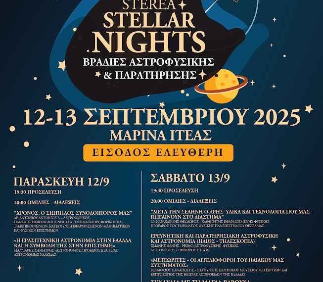 H Περιφέρεια Στερεάς Ελλάδας, σε συνεργασία με τον Δήμο Δελφών και τη Δημοτική Ενότητα Ιτέας, διοργανώνει το 4o Φεστιβάλ Αστροφυσικής και Παρατήρησης Νυχτερινού Ουρανού. Το Φεστιβάλ θα πραγματοποιηθεί το διήμερο 12 και 13 Σεπτεμβρίου στην Μαρίνα Ιτέας. Η εκδήλωση θα ξεκινήσει με την διάλεξη: “ΧΡΟΝΟΣ, Ο ΣΙΩΠΗΛΟΣ ΣΥΝΟΔΟΙΠΟΡΟΣ ΜΑΣ”, του Δρ. Αντώνιου A. Αντωνίου, Αστροφυσικού,